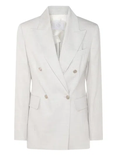 This women's blazer from Eleventy is crafted from a blend of wool and linen in a soft ice grey hue. It features a peaked lapel collar and a double-breasted front secured with elegant silver buttons. The design includes front flap pockets, buttoned cuffs, and a breast pocket, along with a central back vent for added comfort. The blazer is fully lined and has padded epaulettes, offering a regular fit. Made in Italy.