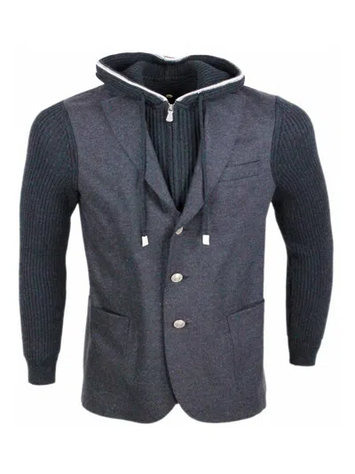 Single-breasted jacket in fine, soft wool with bib and detachable hood in half english rib. patch pockets and metal buttons