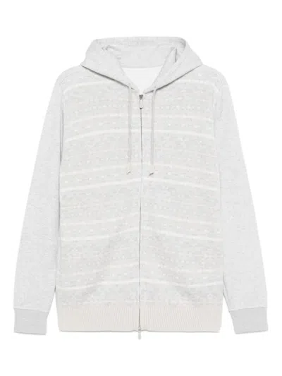 light grey wool drawstring hood zip fastening ribbed hem patterned body long sleeves