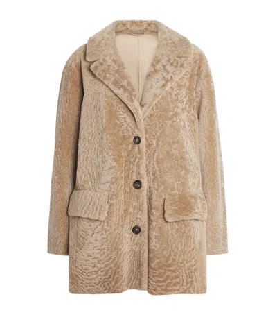 With its thick, sumptuous merino shearling, this Eleventy coat makes a distinguished statement with ease. The oversized silhouette is accentuated by large notched lapels, while the specialised Astrakhan-effect finish on the wool creates a rich, curly texture that delivers a plush hand feel.