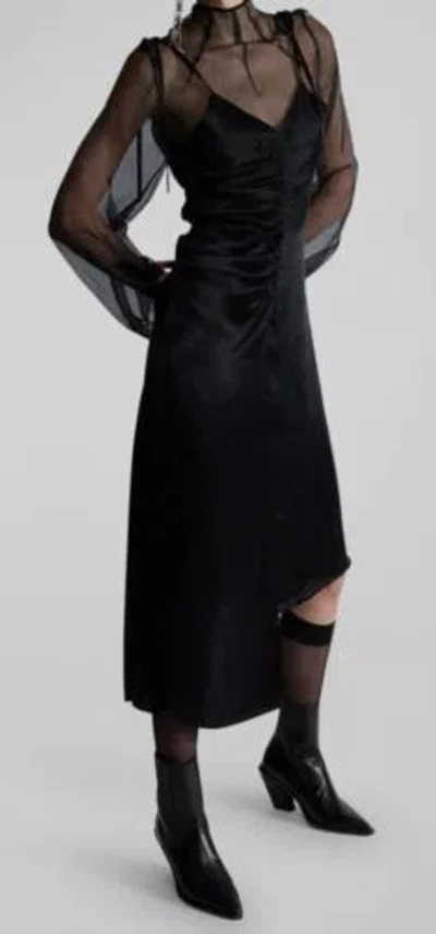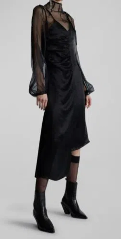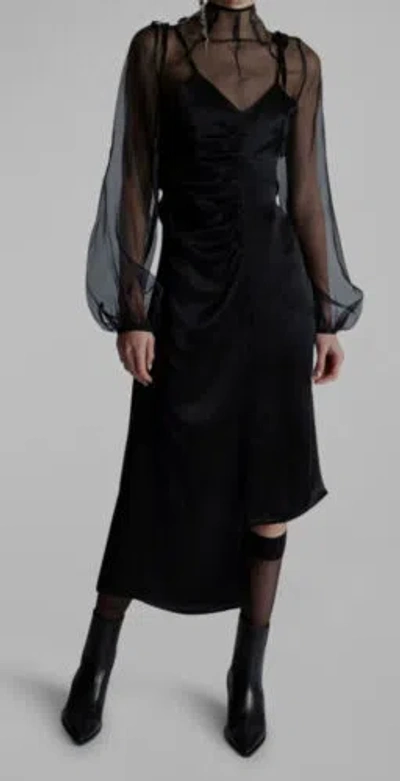 Pre-owned $751 Women's Black Silk High Mock-neck Ruched Midi Dress Size 40