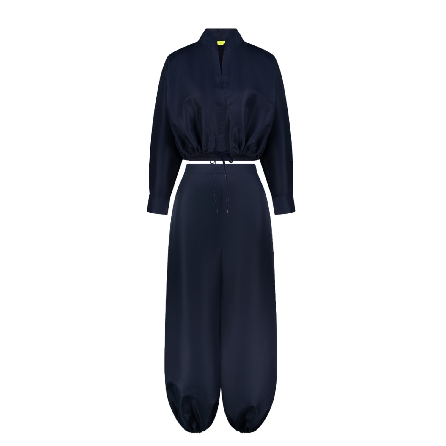 The Astral set embodies refined elegance with its navy top featuring a sophisticated tie waist in the bottom front, creating a flattering silhouette. The puffy look adds a touch of chic charm, while the accompanying navy pants exude comfort and style with their flowy design and elasticized ends, providing a graceful and effortlessly fashionable ensemble. Machine wash