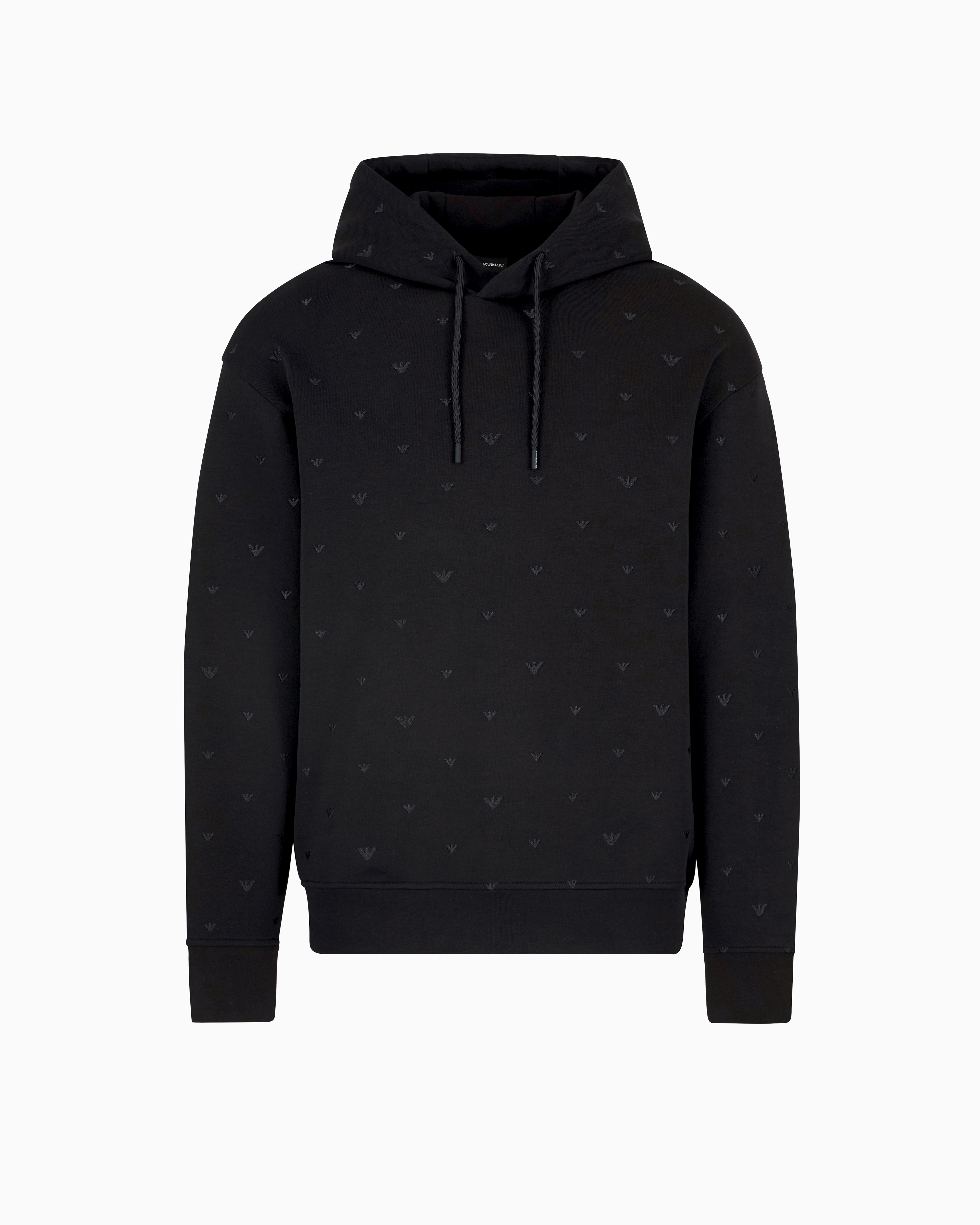 EMPORIO ARMANI Double-jersey Hooded Sweatshirt With All-over Micro Eagle Embroidery In Black