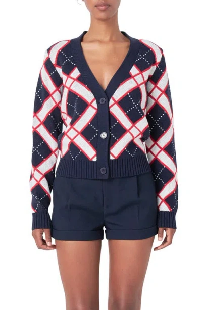 ENDLESS ROSE Diamond Pattern V-neck Cardigan In Navy Multi