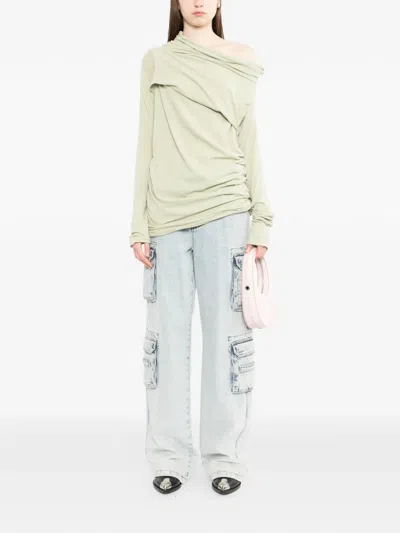 light green off-shoulder long sleeves This piece can be styled in multiple ways.