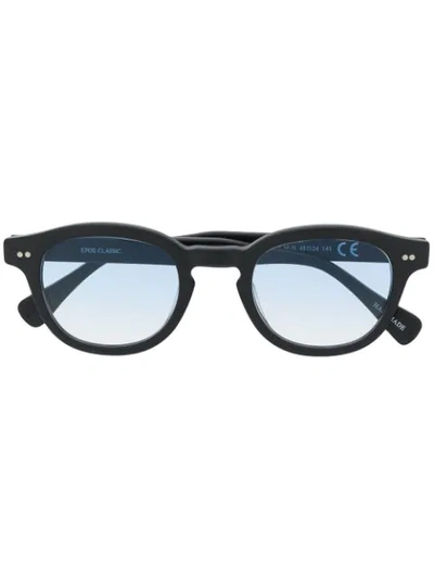 Black acetate Bronte glasses from Epos featuring tinted lenses. This item comes with a protective case. This item is unisex.