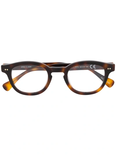 Brown acetate round frame glasses from Epos featuring patterned frames. This item comes with a protective case. This item is unisex.