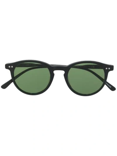 Black acetate round frame sunglasses from Epos featuring tinted lenses. This item comes with a protective case. This item is unisex.