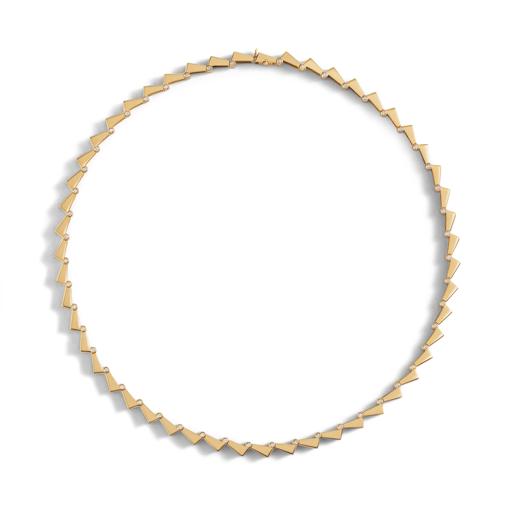 EREDE Hinged Collar in 18Ct Yellow Gold/Diamond: Ready to ship in 3-4 weeks. Somehow both sharp and feminine, this necklace is handcrafted from triangular links made of recycled 18-karat yellow gold. Each one is connected to the next by the brand’s signature diamond-studded hinge. The result? A brilliantly engineered chain unlike anything you own. At 16 inches, it elevates everything from crewneck T-shirts to strapless gowns.18k yellow gold, 0.73 ctw diamond Length: 16.3" Made in USA.