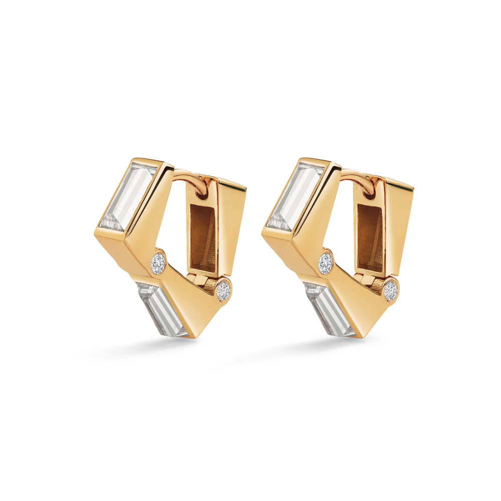 EREDE Hinged Hoops Earring in 18Ct Yellow Gold/Diamond: Ready to ship in 3-4 weeks. Rendered in recycled 18-karat yellow gold, these earrings are made of EREDE’s signature triangle links. Diamond-studded hinges and light-catching baguettes add dimensional sparkle to the geometric silhouette. What’s more, each stone is lab-grown using solar power—a conscious alternative to traditional mining.18k yellow gold, 0.88 ctw diamond Made in USA.