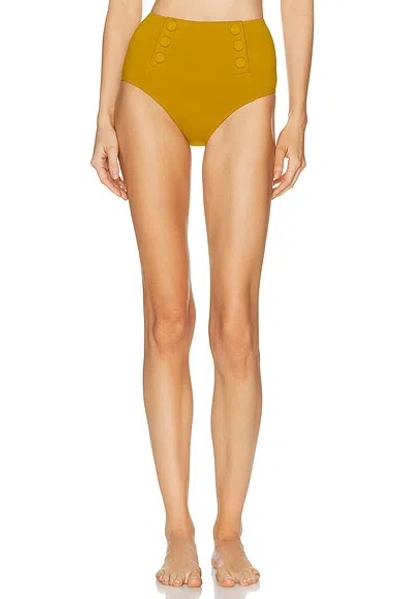 ERES Flaneuse Bikini Bottom in Or - Mustard. Size 36 (also in ). Self: 84% polyamide 16% elastane Lining: 68% polyamide 32% elastane. Hand wash. Front tonal button detail. High waist design. Item not sold as a set. EREF-WX110. 042605. About the designer:
