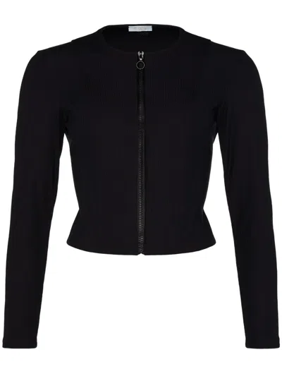 black front zip fastening embroidered logo round neck long sleeves