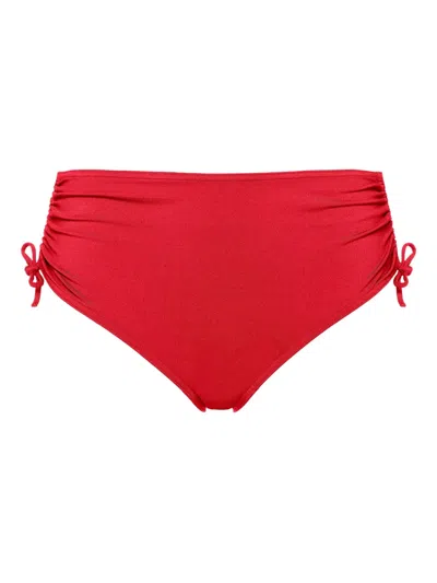 red side ruching drawstring ties high-waisted Be mindful to try on swimwear over your own garments.