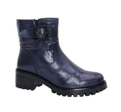 Say hello to the perfect, most versatile boot. The ankle height makes this style easily transition from day to night. Wear them with your favorite skinny jeans and tee for a more laid back look, or pair them with your favorite mini dress and jacket for a night out on the town.Meet the Women's Leah Work Boot by Eric Michael, a blend of style and durability in stunning Blue Metallic. Fashioned from quality leather, these boots feature a practical inside zipper and an eye-catching buckle detail, perfect for your workwear ensemble. The lug sole ensures ample traction, while the 2" chunky heel delivers both comfort and flair. With its emphasis on design and utility, this boot is an ideal choice for your fall vacation wardrobe.