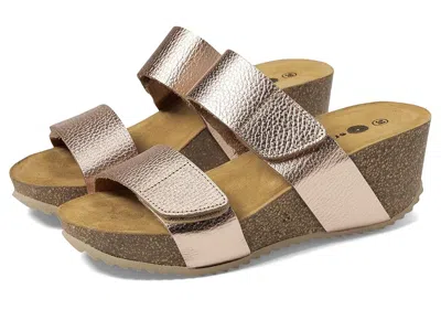 Eric Michael Lily 2 - Women's Sandals : Peach Metallic : Attain an unbeatable stylish look donning the Eric Michael Lily 2. This wedge-heeled sandal has a two-adjustable hook-and-loop strap closure, open round toe design, and cushioned footbed to relieve heel pain. ; Rubber upper. ; Leather lining. ; Leather insole. ; Slip-on style. ; Brand detailing on the footbed. ; Rubber outsole. ; Made in Portugal. Measurements: ; Heel Height: 3 in ; Weight: 8 oz ; Product measurements were taken using size EU 37 (US Women's 6.5-7), width M (B). Please note that measurements may vary by size. | Eric Michael Lily 2 Women's Sandals Peach Metallic : EU 37 (US Women's 6.5-7) M (B), Leather