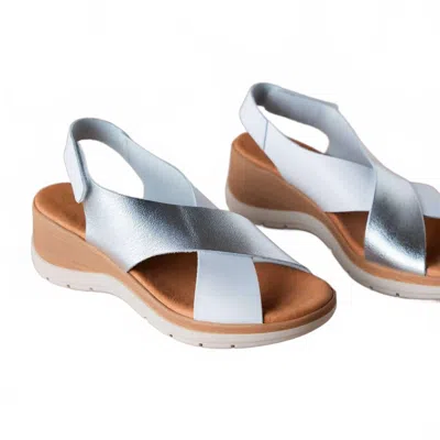 This sandal will take you from brunch to dinner and everything in between.Step into summer style with the Eric Michael Women's Elena Sandal in chic White/Silver, designed for both fashion and function. Crafted with a leather upper and insole, this sandal features bunion-friendly crossed leather straps and an adjustable Velcro heel strap for a personalized fit. Made in Spain, the design showcases a comfortable 0.75" platform on a 2.25" wedge heel. Ideal for a boho chic vacation look, these sandals are perfect for any getaway.