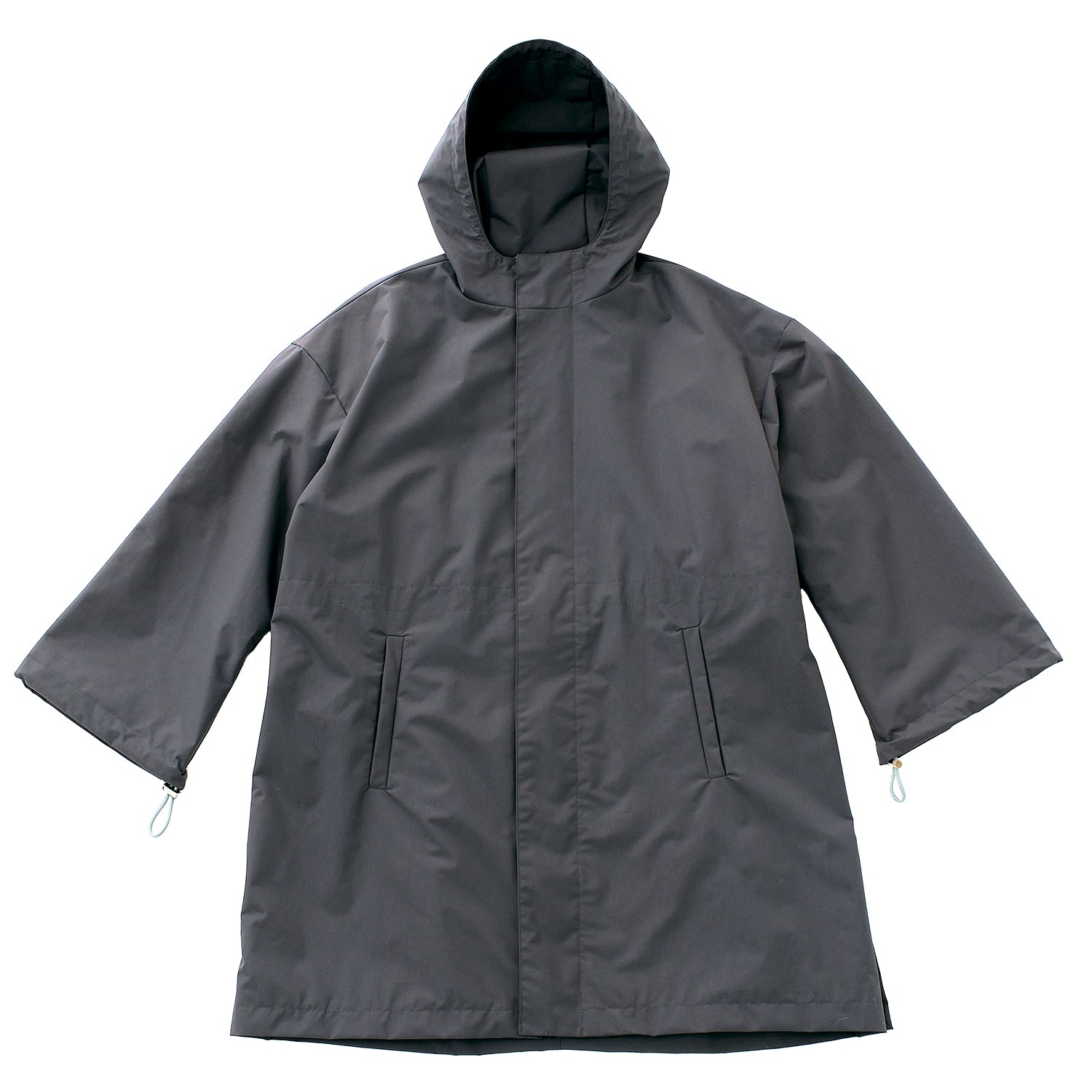 The design combines elements of a classic French cape with the contemporary features of outdoor rain jackets. The relaxed, oversized A-line silhouette is complemented by a fly-front fastening and wide side vents on the hem. The quality metal parts are chosen for longevity and recyclability. The nylon fabric, which has excellent waterproof and breathable properties, is made from recycled nylon (53%) and vegetable-derived components for the inner coating, which enables the reduction of approximately 30-50% in CO2 emissions compared to conventional petroleum-based nylon fabrics. Additionally, the liner is crafted from the finest 100% organic cotton typewriter textile from a renowned Japanese textile maker. The Anthracite colour captures the beautiful hues and textures of natural minerals. OUTER FABRIC: 100% NYLON(URETHANE COATING ON UNDERSIDE) LINING FABRIC: 100% ORGANIC COTTON ・HAND WASH OR MACHINE WASH ON GENTLE. ・DO NOT USE BLEACH, SOFTENERS, OR OPTICAL BRIGHTENERS. ・NEUTRAL OR MILDLY ALKALINE DETERGENTS RECOMMENDED. ・USE LAUNDRY BAG. ・DO NOT TUMBLE DRY (HANGING TO DRY IS RECOMMENDED). ・DO NOT IRON NYLON FABRIC.