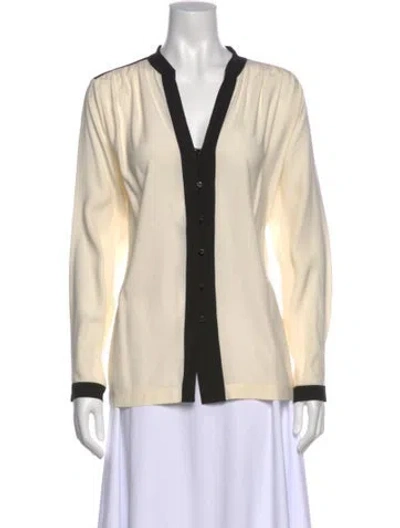 Escada Silk Blouse Neutrals Colorblock Pattern Long Sleeve with V-Neck Button Closure at Front Fit: Tops by Escada typically fit true to size. | Escada Silk Colorblock Pattern Blouse in Neutrals, Women's US10, DE40 | L