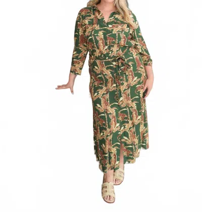 Who doesn't love a good maxi dress? This one you'll be reaching for season after season.Introducing the Allegra Maxi Dress by Escapada, a stunning piece for your vacation wardrobe. This long sleeve dress showcases a sheath silhouette with a collar neckline, featuring a jungle green base with exquisite gold cheetah palm prints. Embrace the maximalist trend with its bold pattern, crafted without pockets for a streamlined look.