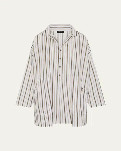 Eskandar artists smock shirt featuring a pleated collar and sloped shoulders Mini multistripe shirting Stand collar; half button front Long sleeves Sloped shoulders Hip button patch pockets Wide Aline fit Long plus length Cotton Unlined Made in Poland