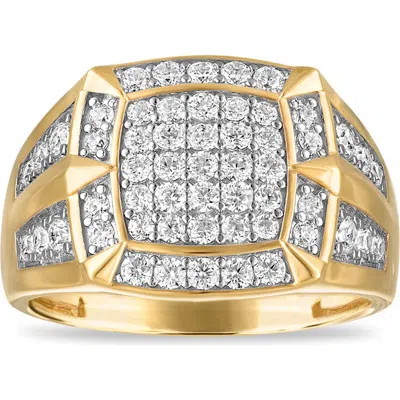 Fifty-five, round white diamonds encrust the top and sides of this polished ring crafted from warm goldtone-plated sterling silver. Total diamond weight: 1ct. Color: F Clarity: SI2 Sterling silver/goldtone plate/diamond Imported Diamond Guide