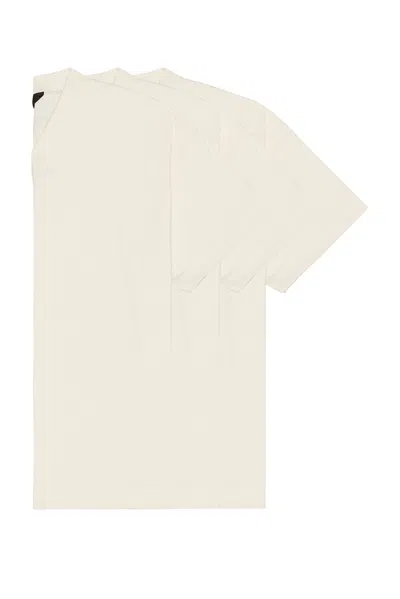 Fear of God ESSENTIALS 3-Pack Essential V-Neck Tee in Shell - Cream. Size M (also in L, S, XL). 53% cotton 40% polyester 7% rayon. Made in China. Hand wash. V-neck design. Back collar logo detail. Lightweight jersey fabric. Pack of 3. FALF-MS15. 125BT244352F. About the designer:
