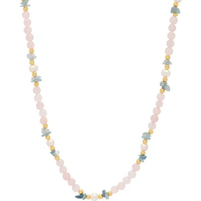 Smooth and chipped beads of rose quartz and aquamarinf bring a natural glow to this stack-ready necklace. Toggle closure Rose quartz/aquamarine/faux pearl/goldtone plate Imported