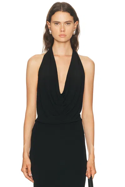 Eterne for FWRD Paris Top in Black 95% rayon 5% spandex. Made in Korea. Dry clean only. Pull-on styling. Stretch jersey fabric. Open back styling. Garment is made with a semi-sheer fabric, undergarments can show through. ETEF-WS178. ES322-54. About the designer: