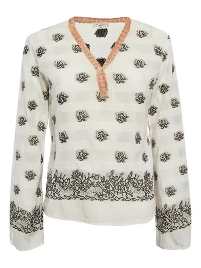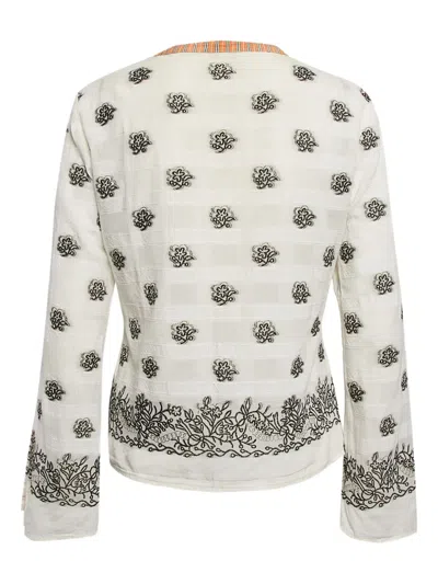 white front button placket V-neck long sleeves embroidered motif Condition: GOOD. This previously owned and used item is in good condition with minimal signs of use. This may include fading of material or plating and scratches.