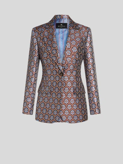 multicolour patterned jacquard peak lapels front button fastening two side flap pockets long sleeves straight hem
