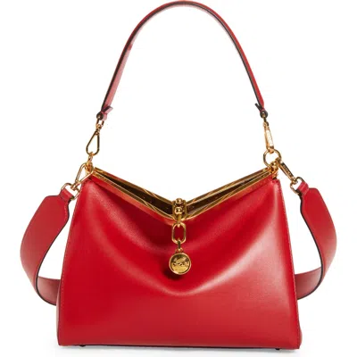 Iconic medium Vela bag in leather. This model can be carried by hand or on the shoulder, thanks to the detachable, interchangeable shoulder strap and handle. This model stands out for its distinctive metal fastening and the medallion bearing the ETRO logo and Pegaso symbol engraved using the same technique used to mint coins. Complete with a convenient, zip-fastened clutch inside. Size: 8.46 x 11.02 x 4.33 inches (21,5 x 28 x 11 cm) Detachable shoulder strap Metal feet Removable mini pouch Light golden-finish metal accessories Made in Italy