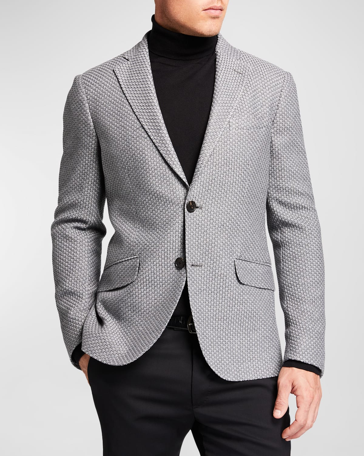 Textured knit blazer by Etro. Notched collar; two-button front. Barchetta chest pocket; flap pockets at waist. Double vent. Finished sleeves. Cotton. Made in Italy.