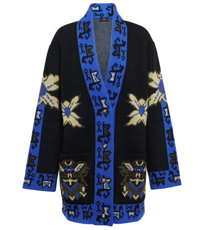 Geometric-pattern Jacquard knitted cardigan from ETRO featuring black, blue, wool, chunky knit, patterned jacquard, logo-embossed buttons, V-neck, front button fastening, long sleeves and straight hem.