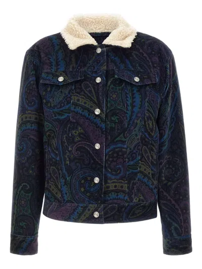Immerse yourself in the refined artistry of Etro with this exquisite corduroy jacket, thoughtfully crafted for those who appreciate timeless sophistication. This classic trucker silhouette, in a deep navy hue, is elevated by a sumptuous paisley motif that explores emerald, violet, blue, and turquoise each shade elegantly set against the rich corduroys pronounced texture. The cream faux shearling collar adds an inviting contrast, embracing the neck in soft warmth, while the polished metal buttons, each bearing a subtle designer engraving, underscore the jackets meticulous attention to detail. Dual chest flap pockets with snap closures marry form and function, highlighting the pieces practical allure. Why choose this product? Distinguished Italian design by Etro, celebrated for its iconic paisley signature Luxurious corduroy provides resilience and a captivating tactile finish Rich, multicolored pattern for an unmistakably unique appearance Contrasting cream faux shearling collar for an elevated touch Subtly engraved metal hardware, reflecting superb craftsmanship Composition: 98% Cotton 98% Cotton 2% Elastane 2% Elastane