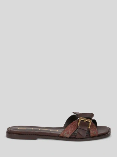 Square-toe slides in iconic Paisley fabric with crossover design. Both the buckle on the upper and the insole are embellished with the ETRO logo. Made in Italy