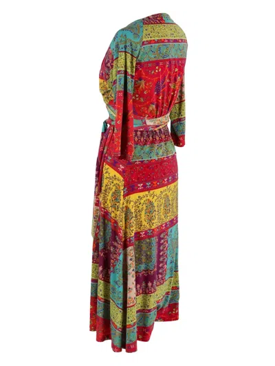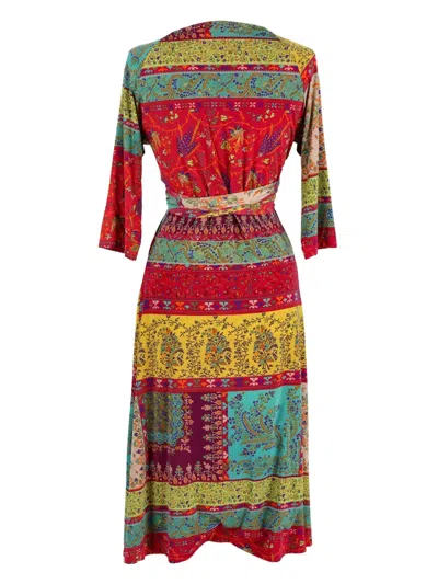 red/multicolour stretch-design mix print wrap design side tie fastening half-length sleeves mid-length straight hem Condition: GOOD. This previously owned and used item is in good condition with minimal signs of use. This may include fading of material or plating and scratches.