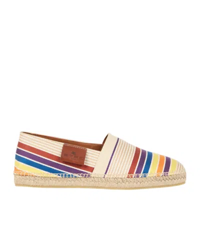 Espadrilles, die sich durch ein mehrfarbiges Streifenmuster auszeichnen. Das Modell ziert ein Lederschild mit Pegaso und ETRO-Logo. Der Schuh ruht auf einer Sohle aus geflochtener Jute. Label mit Pegaso und ETRO-Logo Geflochtene Sohle Made in Spain