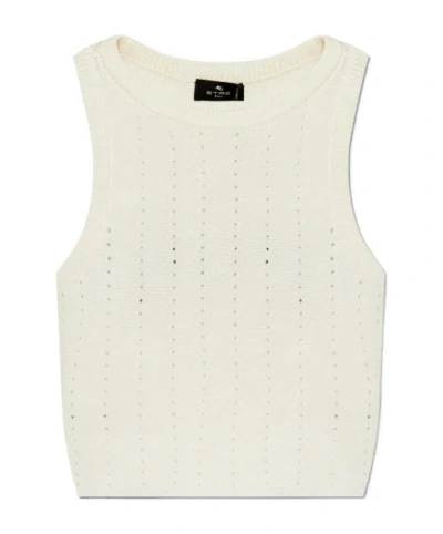 Round neckline and ribbed armholes Sleeveless All-over openwork pattern Crop and slim fit Color: ivory 60% Cotton, 40% Viscose Made in Italy