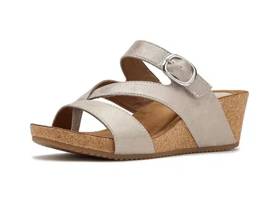 EuroSoft Emrie - Women's Sandals : Silver/Gold : Ascend in heightened comfort as you wear the EuroSoft Emrie Sandals. The slip-on footwear features polyurethane upper construction with toe loop and buckled ankle strap for a secure fit. ; Breathable fabric cushion lining and comfort channel footbed. ; Cork wedge heels. ; Open almond toe silhouette. ; Lightweight and flexible thermoplastic rubber outsole. ; Imported. Measurements: ; Heel Height: 3 in ; Weight: 7.4 oz ; Product measurements were taken using size 8, width B - Medium. Please note that measurements may vary by size. | EuroSoft Emrie Women's Sandals Silver/Gold : 11 B - Medium, Synthetic
