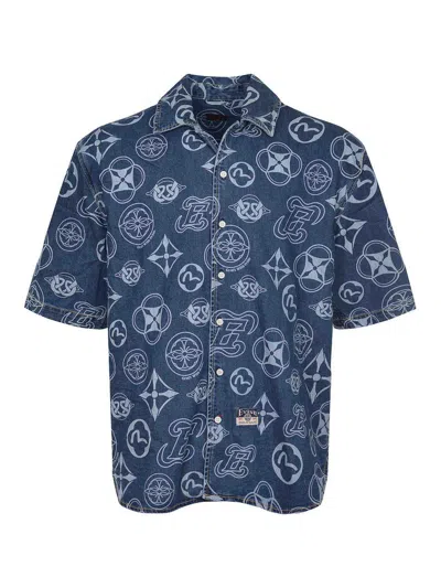 Evisu shirt made of dark blue denim. Short sleeves. Classic collar. Button closure on the front. Contrasting logo and prints on the front and back. Embroidered logo label on the bottom. 100% cotton Composition: 100% Cotton
