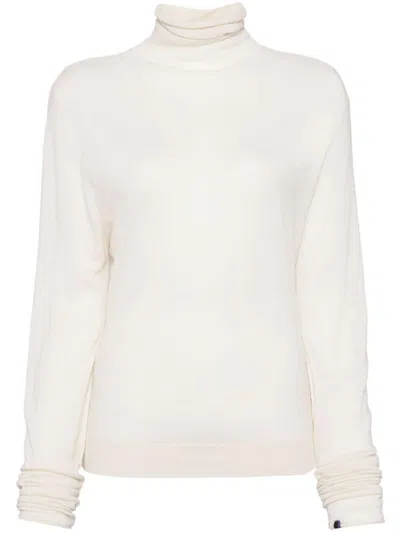 cream white cashmere fine knit semi-sheer construction roll neck long sleeves ribbed hem embroidered at the sleeve