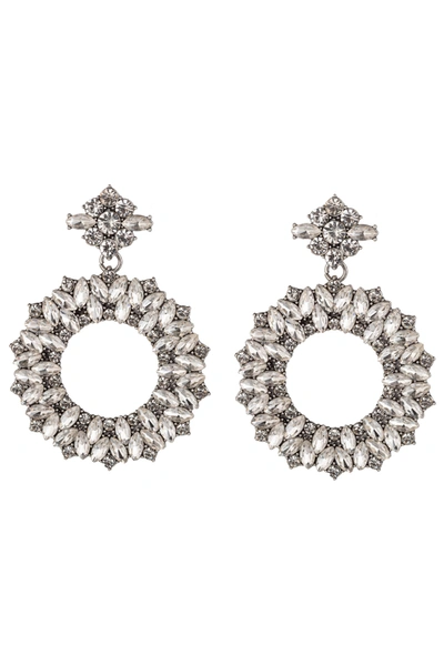 Add a splash of color to your ensemble with these stunning loop earrings! Shimmering silver alloy and brilliantly colored glass crystals dance amongst each other to give these statement earrings their stunning appeal. Pair these beautiful silver earrings with a matching silver bracelet to complete the jewelry set! Also available in other colors.Product Details - Metal - Alloy Stone Type - Glass Size - 3" length Clasp - Pushback
