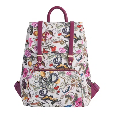 Travel light with our Floral Engravings Small Plum Backpack. Featuring intricate botanical prints and buckled alternative to leather straps, this compact backpack is perfect for carrying essentials during your cultural explorations. With multiple pockets and a roomy interior, it's an essential everyday piece for art and history enthusiasts. Colour: Purple/Multi One main compartment, one inner zipped pocket. Double tabs with buckle details. Strap Type: Adjustable straps Closure: Magnetic closure Height: 32 cm (12.6 in), Width: 20–24 cm (7.9–9.4 in), Depth: 10.5 cm (4.1 in) Handle Drop: 6.5 cm (2.6 in) Composition: 100% Polyester Inner lining: 100% Polyester Care: Wipe clean with a damp cloth. Avoid prolonged exposure to moisture or direct sunlight to preserve the material and colour.