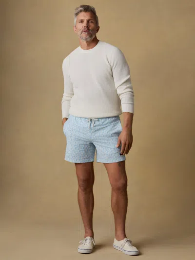 Designed to take Faherty's All Day Short into the water, this swim trunk blends relaxed, surf-inspired style with versatile performance for long days in and out of the sun. Made from our signature All Day 2.0 fabric with a traditional mesh liner, it features bold, larger-scale prints, an exterior drawcord and easy stretch for a timeless, beach-ready feel. Fit: Classic Fit, 6" inseam Detail: Elasticated waistband. Mesh brief lining. Braided drawcord with metal tips. Side seam pockets. Patch pocket at wearer's right backside with velcro closure. Side seam vents. Woven Sun & Waves label at wearer's left hem. Woven Faherty label at back pocket. Thread eyelets at center back. Material: 37% REPREVE® Takeback™ Recycled Polyester, 35% REPREVE® Recycled Polyester, 20% Organic Cotton, 8% Elastane Model: is wearing size Medium Care: Turn inside out. Machine wash cold separately. Delicate cycle. Do not bleach. Tumble dry low. Remove promptly. Cool iron when needed. MSS2600-CYE Faherty Men's All Day Trunk (6") - Clear Sky Leaf, Small, Cotton/Polyester/Fabric