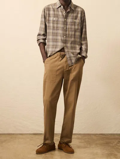 Easy-going vibes, rugged appeal. Effortlessly broken-in, these pants feel like old favorites from the very first wear with a stretch twill fabric and garment-dyed finish. We added an elastic back waistband for all-day ease and a drawcord to ensure the perfect fit. Fit: Relaxed Fit, 31" Inseam Detail: Stretch twill pull on utility pant with patch pockets, elastic back waistband with drawcord. Garment dyed. Material: 98% Organic Cotton, 2% Spandex Care: Close all fastening before wash. Turn inside out. Machine wash cold with like colors. Delicate cycle. Do not bleach. Tumble dry low. Remove promptly. Cool iron when needed. MBS2506-WOK Faherty Men's Dune Utility Pants - Wood Bark, Size 2XL, Cotton/Spandex/Fabric