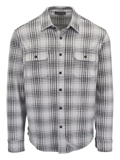 grey plaid pattern button fastening long sleeves chest pockets buttoned cuffs
