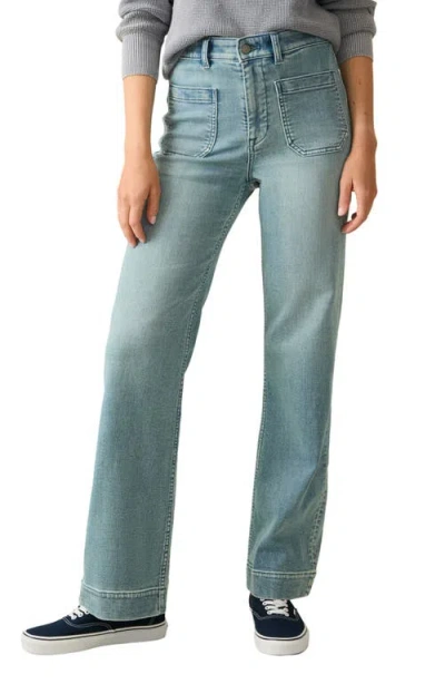 It's all about our signature Stretch Terry fabric in this 70s-inspired high waist, wide-leg style. With all the softness and washed character of your favorite denim and the stretch and comfort of a pair of lounge pants - we've been perfecting these for a few seasons now to be your go-to everyday pants. Fit: Slim through hip and upper thigh, with wide leg. Inseam: 32" Detail: Indigo stretch terry slim wide leg pants with patched front and back pockets. Regular stretch. Material: 83% Cotton, 16% Polyester, 1% Elastane Model: Annelot is 5'10.5 wearing size 26" Care: Close all zippers before wash. Turn inside out. Machine Wash cold With like colors. Delicate cycle. Do not bleach. Tumble dry low. Remove promptly. Warm iron when needed. WBS2330-ESO Faherty Women's Stretch Terry Patch Pocket Pants - Eastern Shore, Size 31, Cotton/Polyester/Fabric