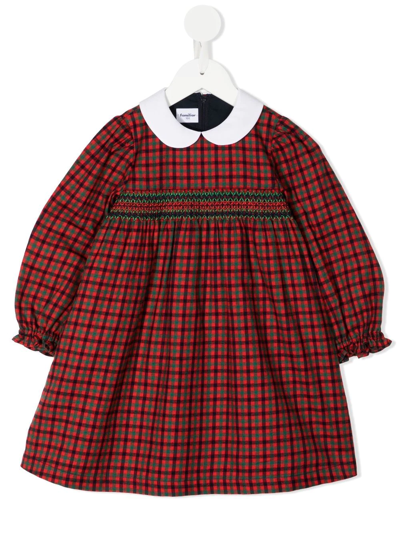 check-print long-sleeve dress from FAMILIAR featuring bright red, cotton blend, check print, smocked panel, Peter Pan collar, concealed rear zip fastening, long sleeves, elasticated cuffs, flared skirt and straight hem.