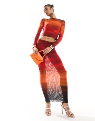 Cleo Mesh Long Sleeve Top And Midi Skirt Set In Red Ombre-multi