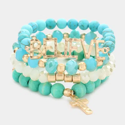 4pcs - Believe Message Cross Charm Semi Precious Wood Ball Faceted Beaded Stretch Bracelets In Blue